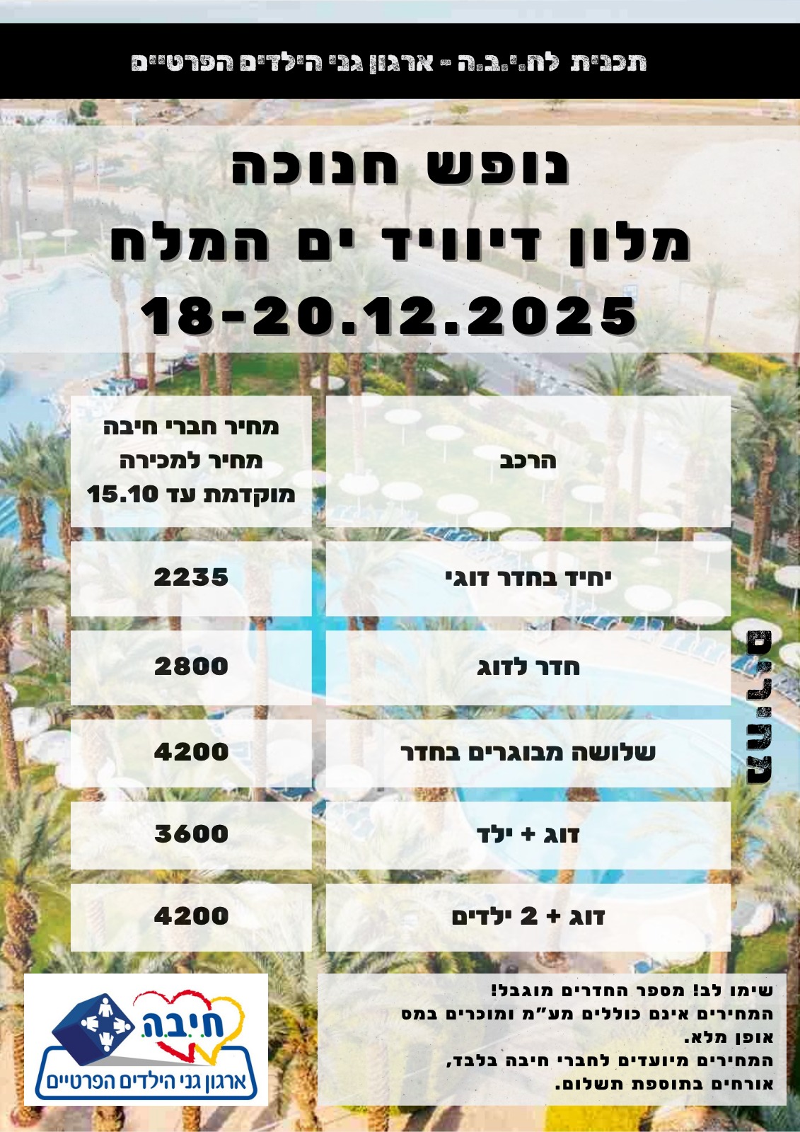 >> נופש חנוכה 2025 מלון דיויד ים המלח